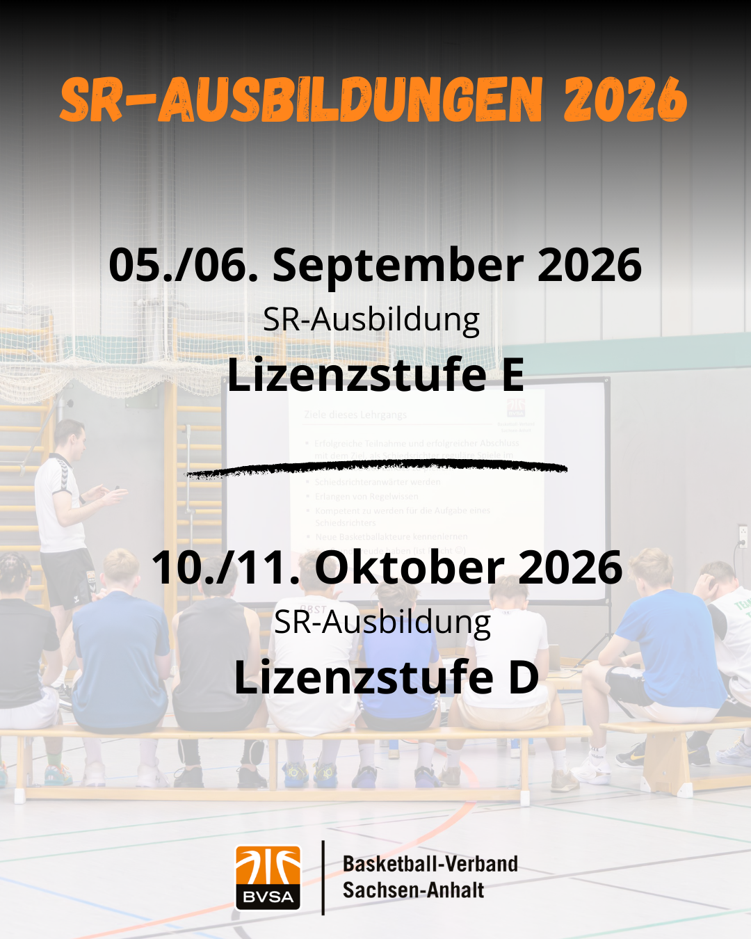 Ergänzend dazu findet am 10. und 11. Oktober 2026 eine Schiedsrichterausbildung zur Erlangung der offiziellen DBB-Lizenzstufe D statt. Auch hier wird der Ort noch veröffentlicht.
